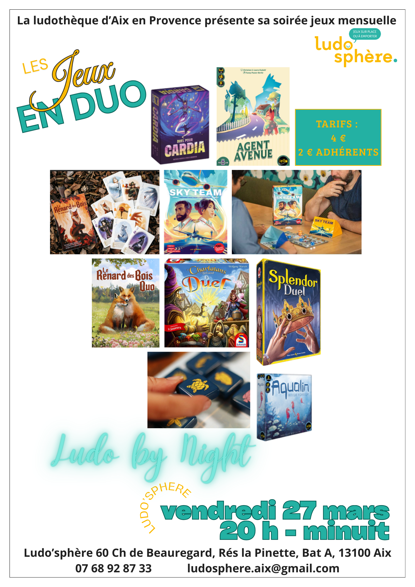 Vendredi 27 : Soirée jeux ludo by night. De 20h à minuit. Une soirée jeux sur le thème des jeux en duo